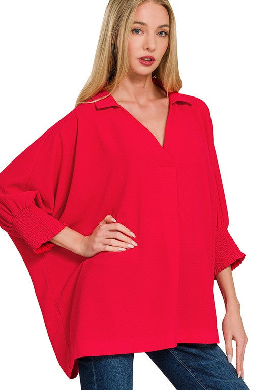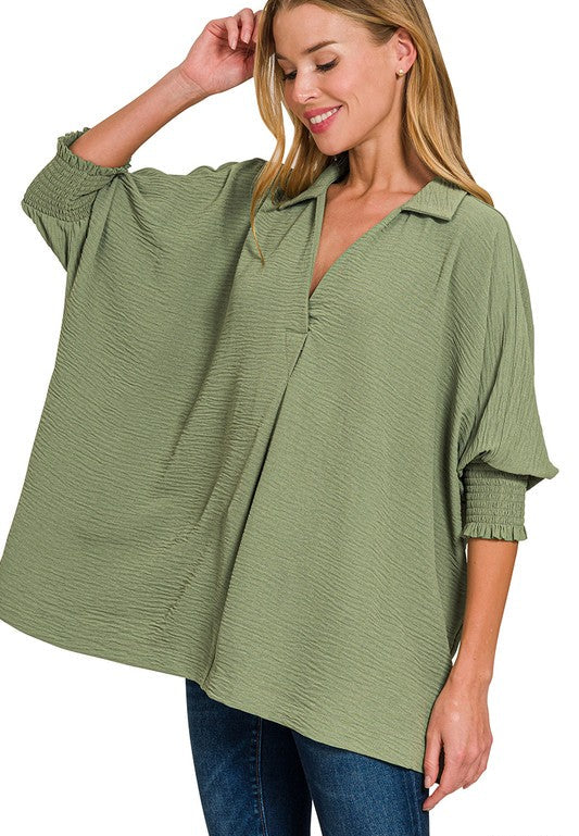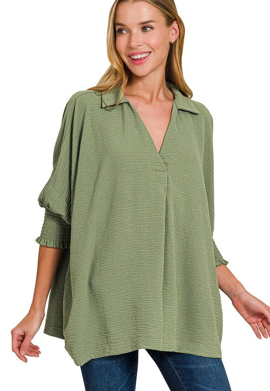 Oversized collared top with smocked sleeve band