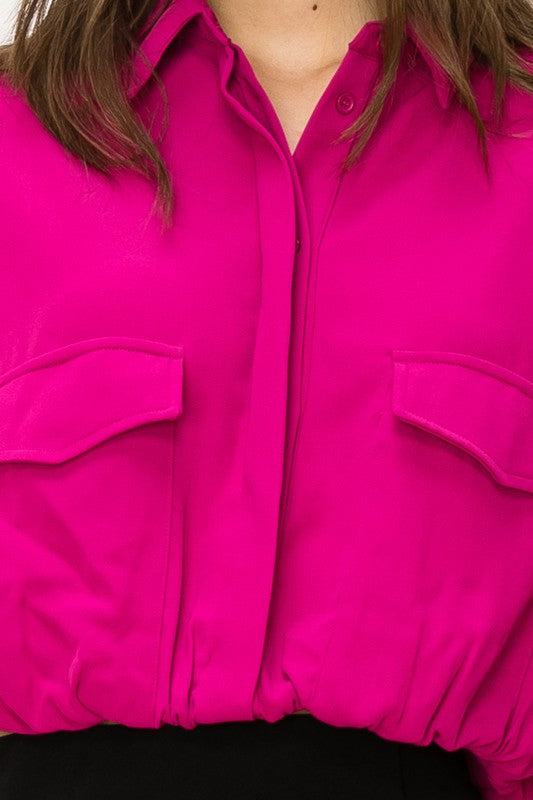 THIS TOP IS ALWAYS SERIOUS WHEN IT COMES TO LOOKING CHIC! IN A CROPPED DESIGN WITH CINCHED WAIST, IT COMES WITH A COLLAR AND DROP SHOULDERS . RELAXED BODICE WITH ELASTIC HEM IS COMPLEMENTED WITH STYLISH FLAP POCKETS AT FRONT.