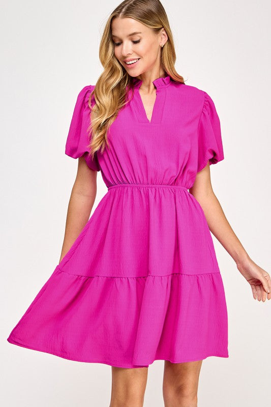 Ruffle v neck tiered dress with mini bubble sleeves and pockets