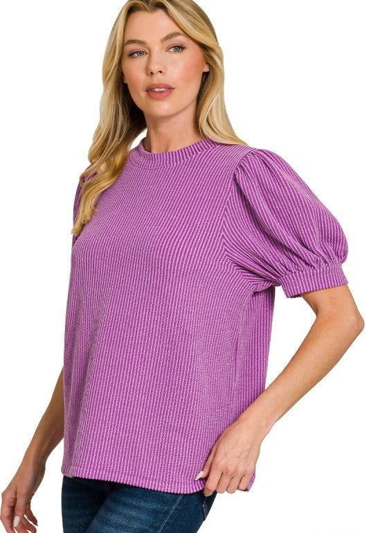 Ribbed top with short puff sleeves