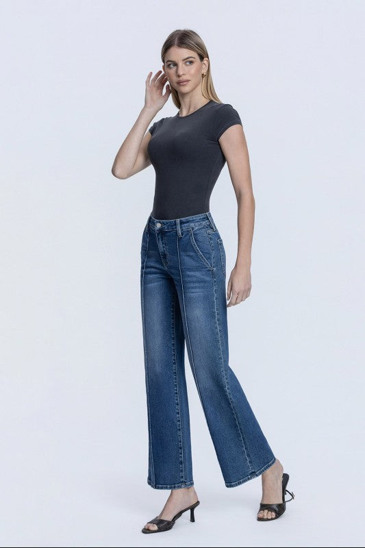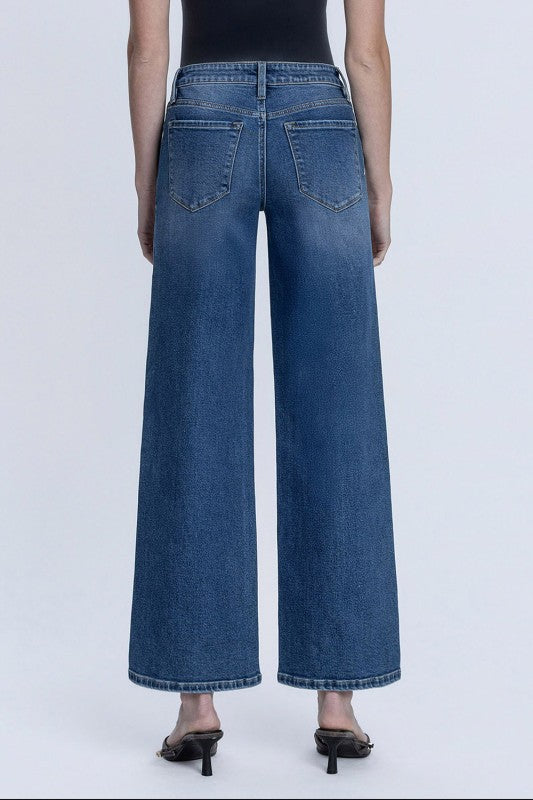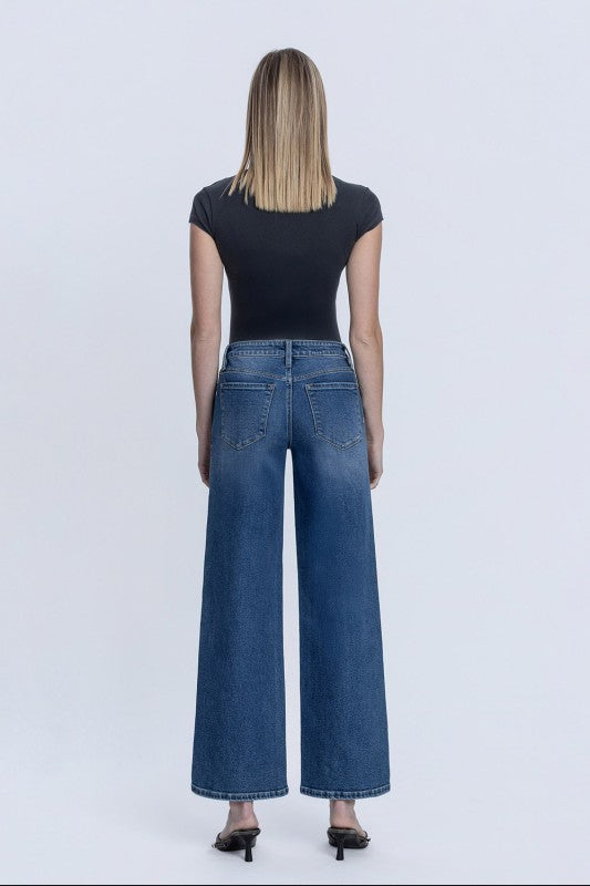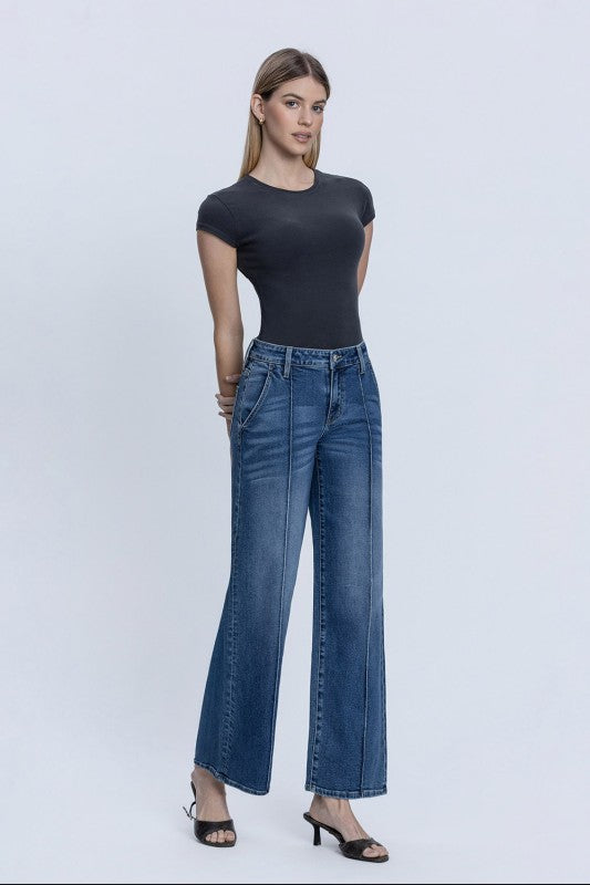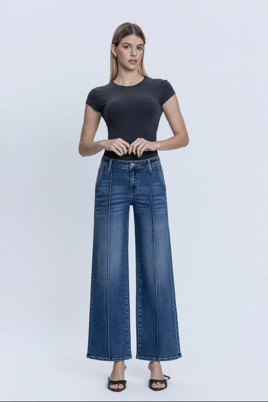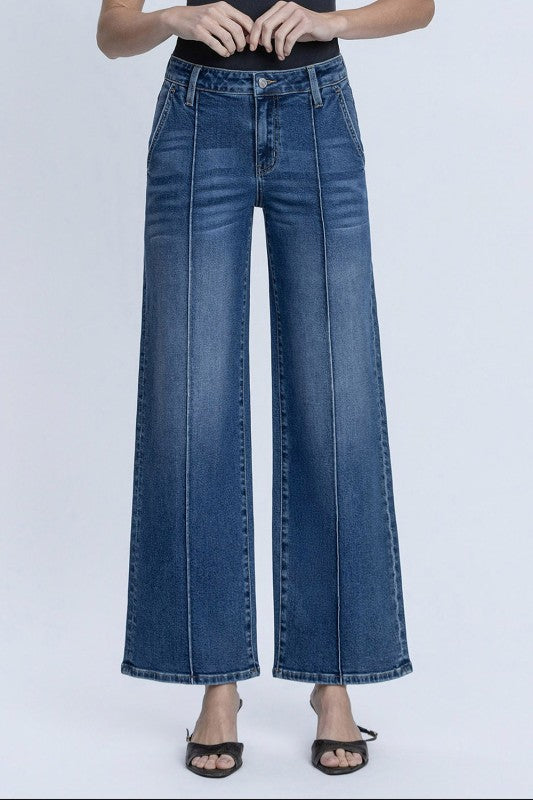 HIGH RISE DARK WASH PINTUCK WIDE LEG JEANS