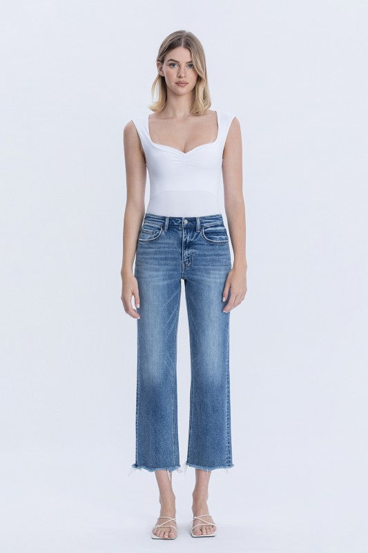 HIGH RISE FRAYED HEM CROP STRAIGHT JEANS