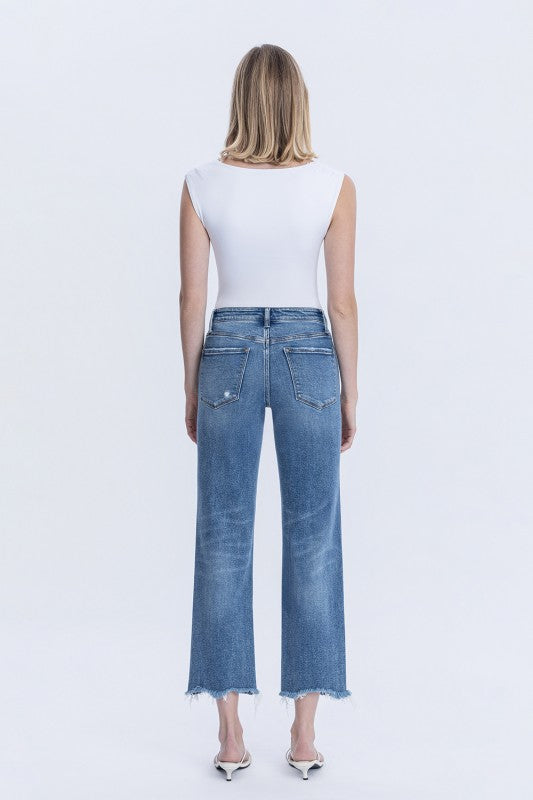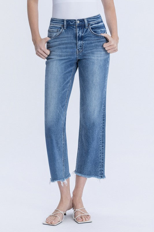 COMFORT STRETCH DENIM, HIGH RISE WAIST, LIGHTLY DISTRESSED DETAIL, FRAYED HEM, CROPPED LENGTH, MEDIUM WASH,. STRAIGHT JEANS