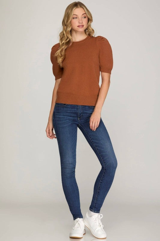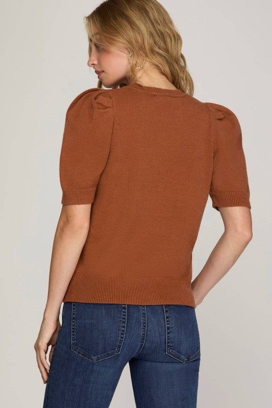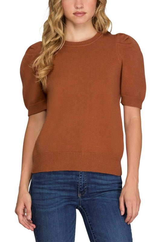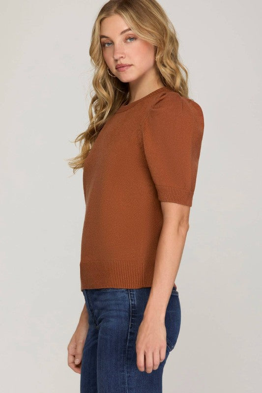 Short sleeve sweater top with rouched shoulder